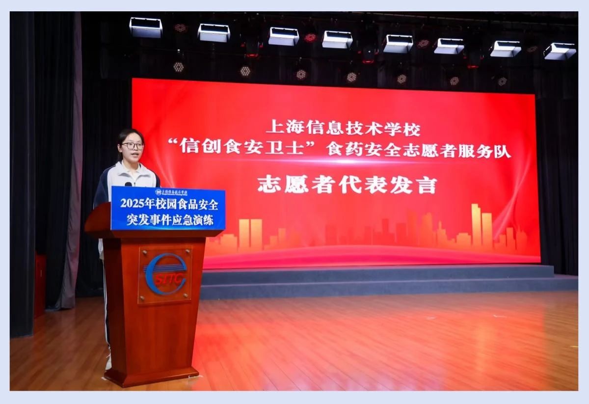 "信创食安卫士"食药安全志愿者服务队的成立,标志着普陀区食品药品安全志愿者队的进一步壮大,为食品安全社会共治体系再添新军。材料与检测系学生沈美琪作为志愿者服务队代表发言。