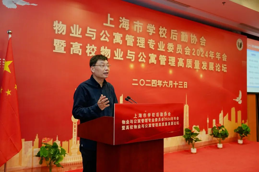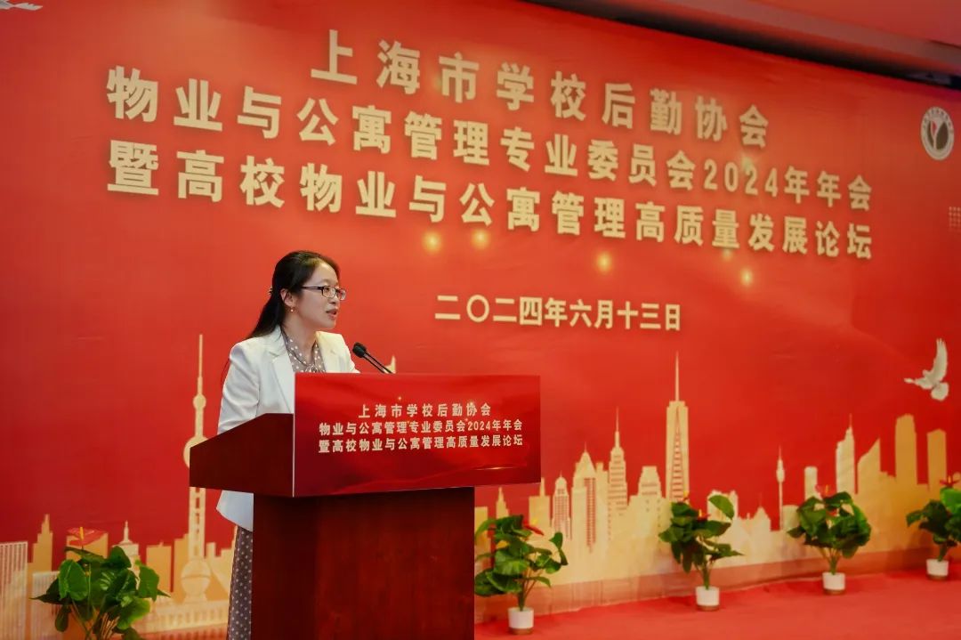 为贯彻落实党的二十大精神和“建设高质量教育体系”的要求,探讨高校物业和学生公寓管理的高质量发展和创新道路,推动高校物业与学生公寓管理的数字化转型,6月13日,上海市学校后勤协会物业与公寓管理专业委员会(以下简称“物专会”)2024年年会暨高校物业与公寓管理高质量发展论坛在东华大学成功举办。东华大学副校长、上海市学校后勤协会副会长阎林平,上海市教育委员会学校后勤保卫处处长、上海市学校后勤协会常务副会长张旭,上海市学校后勤协会副会长兼秘书长、上海高校后勤服务股份有限公司董事长沙德银,上海市学校后勤协会副会长兼常务副秘书长顾中忙出席会议,物专会班子成员及各高校物业和公寓管理人员、相关企业会员代表共200余位参加了本次会议。会议由物专会主任、复旦大学总务处处长朱莹主持。