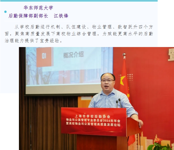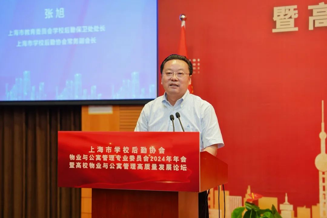 张旭处长对本次论坛的成功举办表示祝贺。他指出,上海高校的物业与公寓管理工作面临诸多机遇与挑战,在建设高质量教育体系的新时代背景下,高校物业与公寓管理高质量发展显得尤为重要。对此张处对物专会在未来如何提升专委会的工作能级,凸显专委会在高校物业和学生公寓管理领域的专业性优势,提出了三点建议:一是要引领高质量发展,探索形成高校物业与学生公寓管理新思路。专委会要聚焦时代需求,积极开拓创新,切实提高理论和实践研究水平。二是要加强自身建设,积极谋划高校物业与学生公寓未来新发展。专委会要以精细化、专业化、智能化管理为目标,顺应智慧校园发展趋势,积极推进数字化、标准化建设。三是要做强服务平台,着力丰富高校物业与学生公寓服务新内涵。专委会要发挥好桥梁纽带作用,不断加深行业间交流,形成共谋行业发展的新常态,提升平台服务能级。他希望大家能以本次论坛为契机,以“新担当、新突破、新作为”,为推动高校物业与公寓高质量发展贡献更大力量。