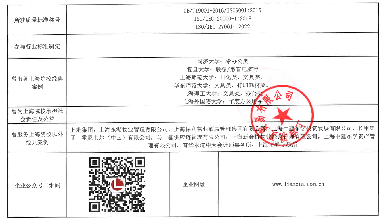 上海联夏贸易有限公司成立于 2000年,通过网上商城、电商平台、门店、渠道等 020多种销售模式,致力于打造涵盖办公及办公周边的办公生活服务平台。公司秉承“专注服务,诚信至上”的理念,自有网上商城(联夏商城)让采购更便捷。自营仓储,自营配送团队,“服务到桌”,为实现“联夏让办公生活更便捷”而努力。 公司注册资金1000万,员工50余名,自有配送车辆12辆,仓库面积约3500余平方米。公司设有直销部、大客部、客服部、采购部、电商部、仓储物流部、财务部、行政部等。公司与众多著名品牌生产商建立了紧密的合作关系,如联想、华为、佳能、理光、晨光、史密斯、得力、齐心、APP、亚太森博、Double A等。公司目前扎根上海,辐射华东。已发展成为上海地区办公生活用品最大的服务商之一。 公司 2024年销售额4.2亿元,2023年销售额3.3亿元,2022年3.1亿元。已与上海音乐学院、上海复旦大学、上海外国语大学、上海交通大学、上海理工大学、上海财经大学、上海戏剧学院、惠灵顿、包玉刚、平和国际学校等院校达成合作,并取得上海包玉刚外国语学校2023年度优秀供应商证书。