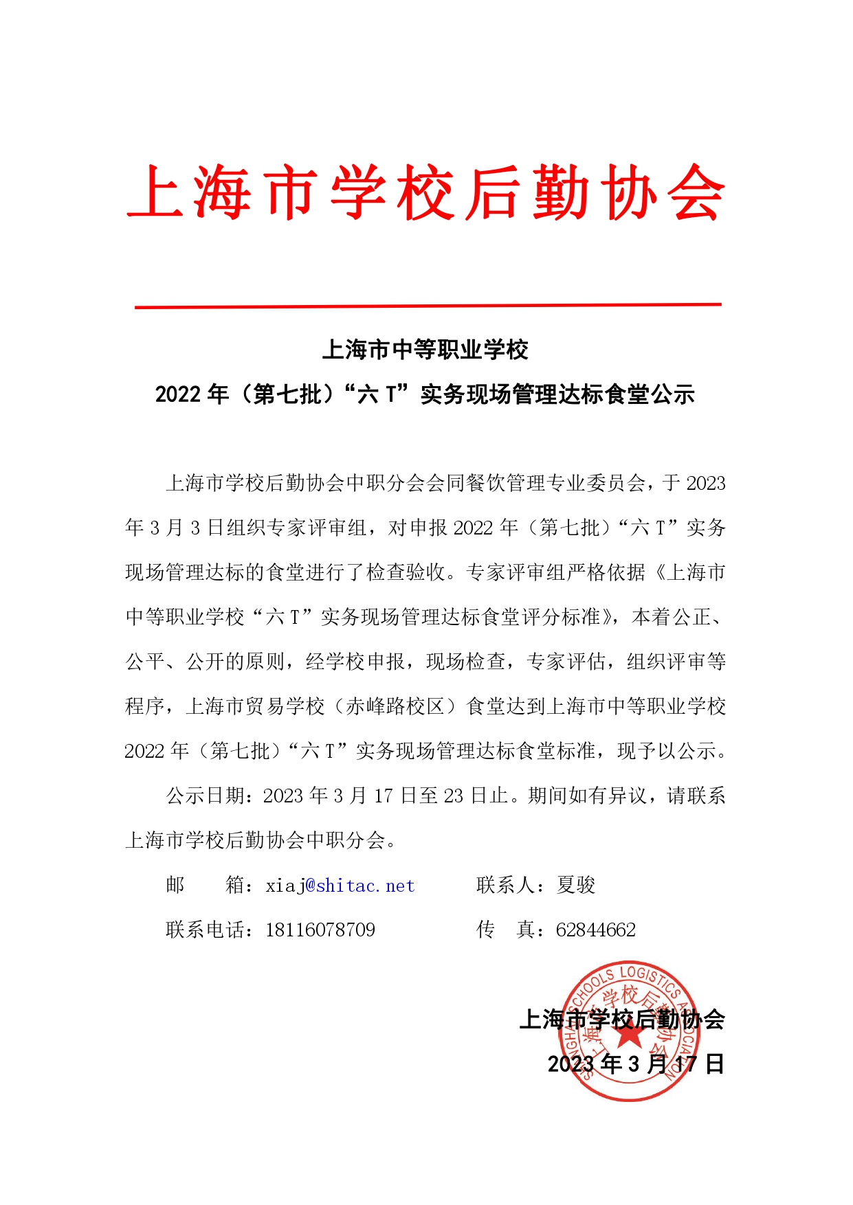 上海市中等职业学校 2022 年(第七批)“六 T”实务现场管理达标食堂公示
