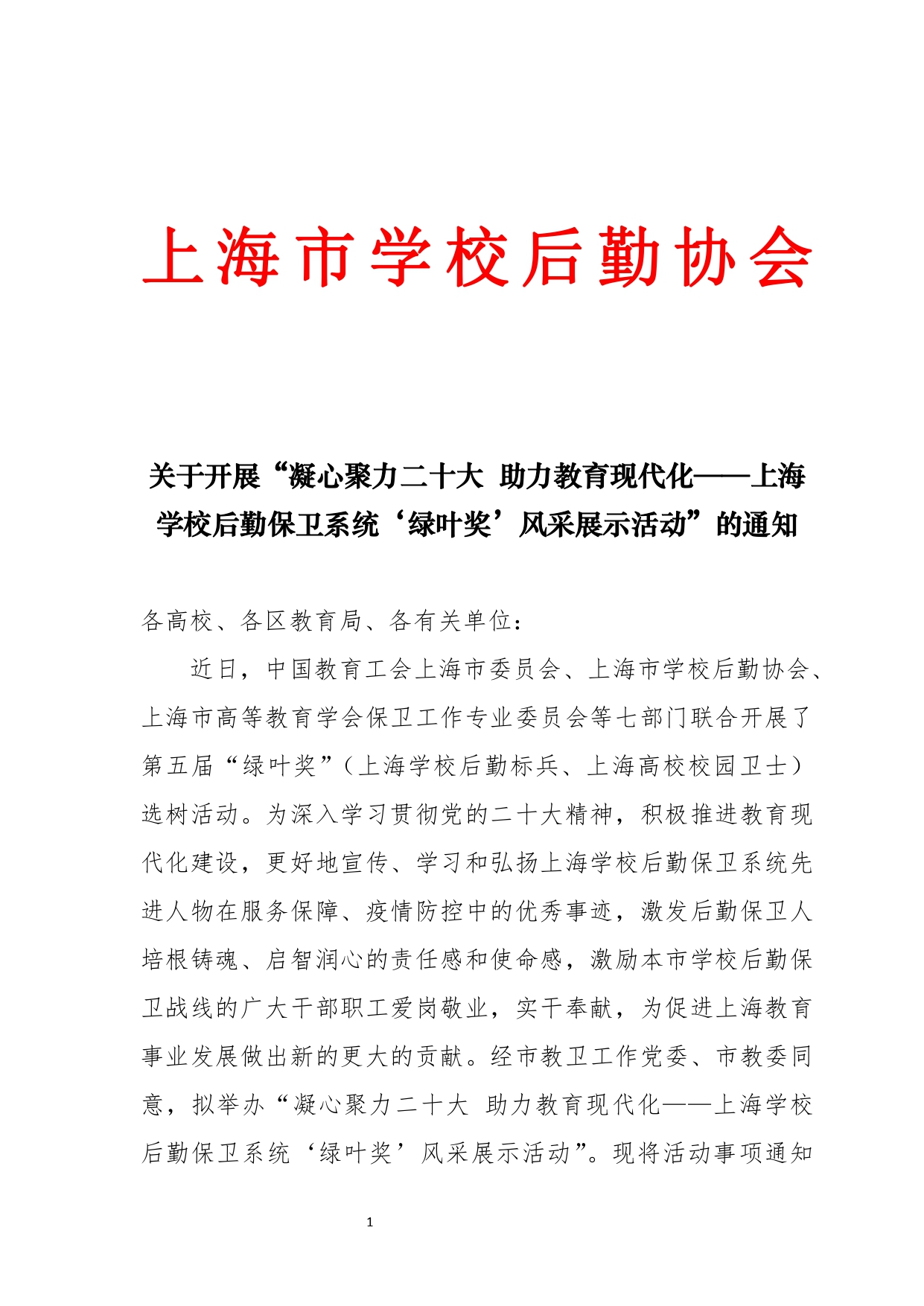 关于开展“凝心聚力二十大 助力教育现代化——上海学校后勤保卫系统‘绿叶奖’风采展示活动”的通知