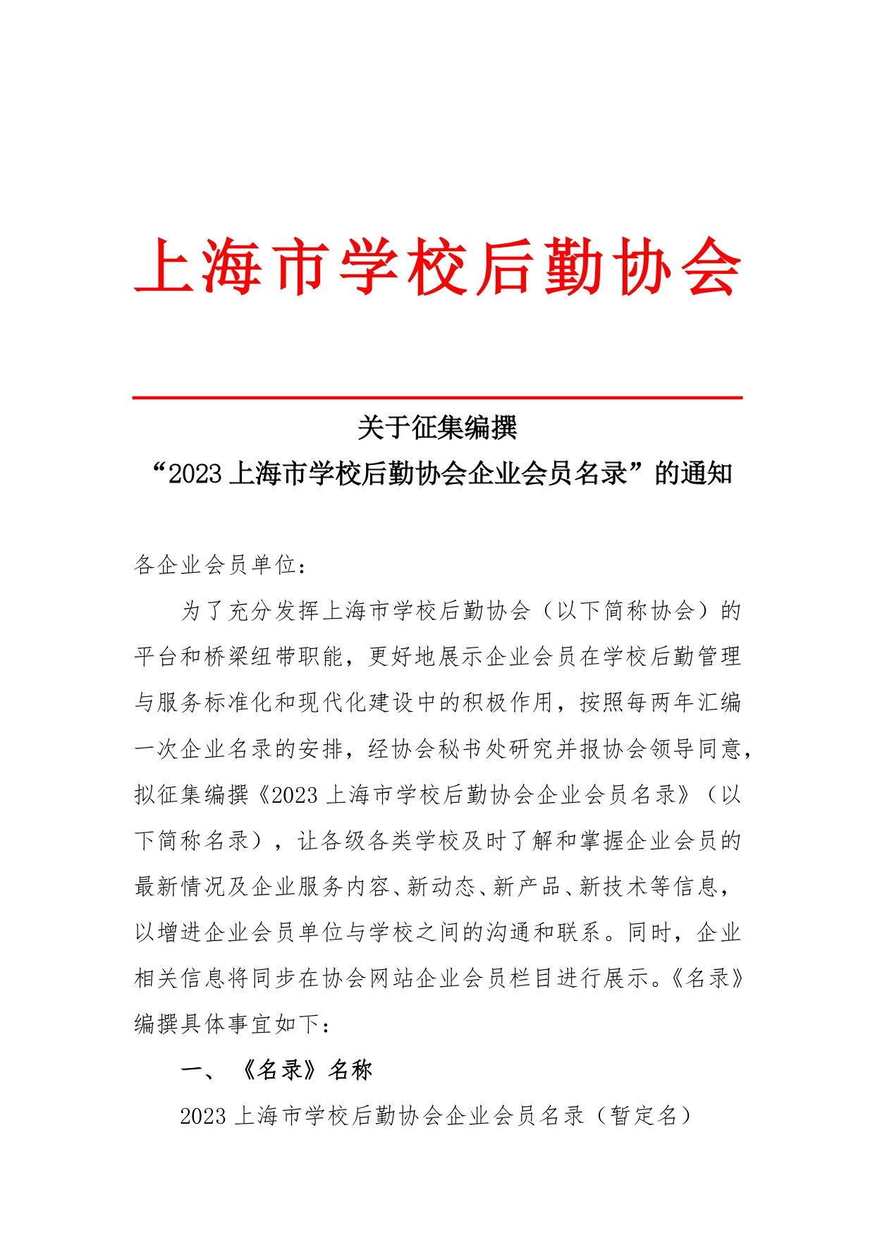 关于征集编撰 “2023 上海市学校后勤协会企业会员名录”的通知