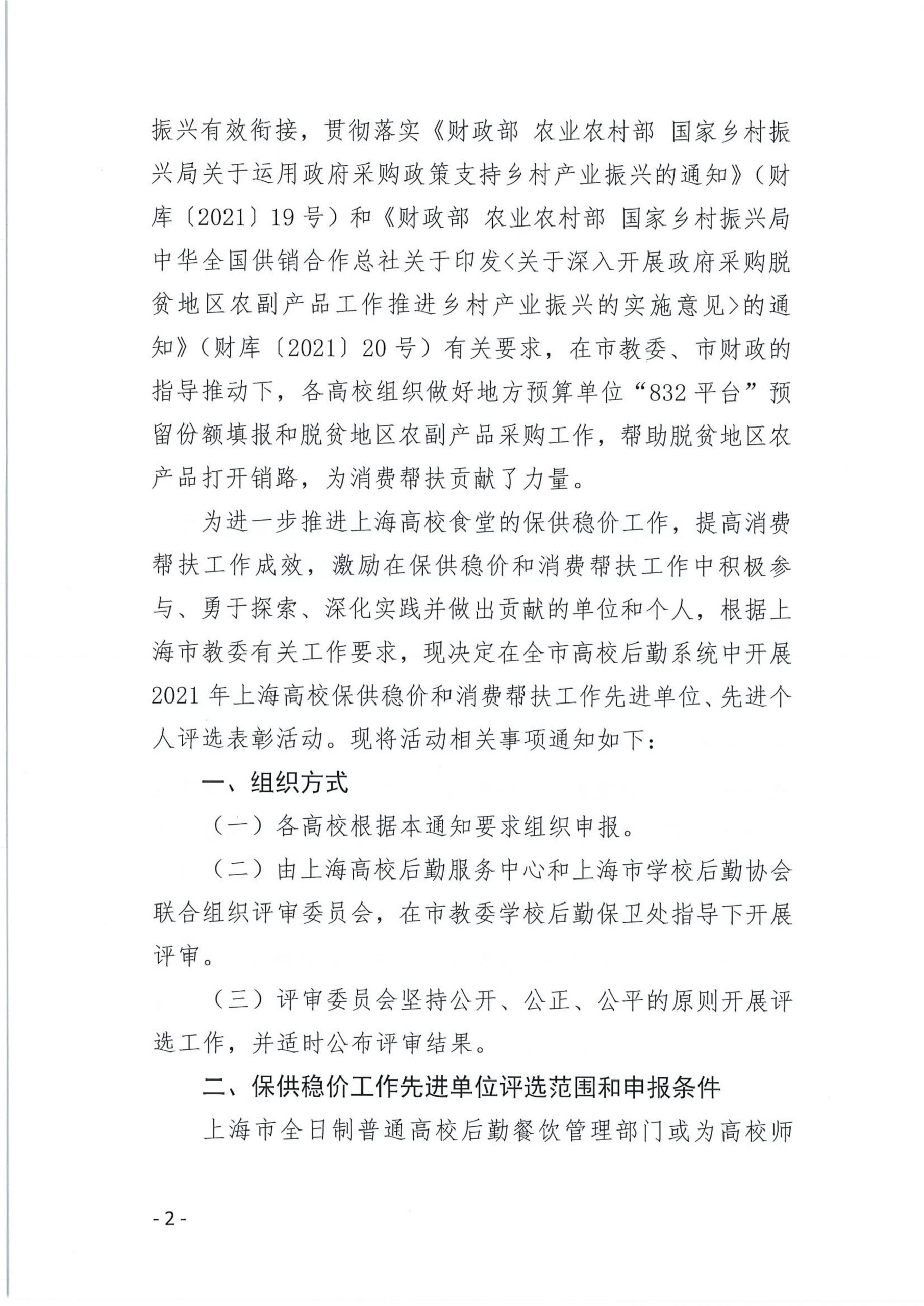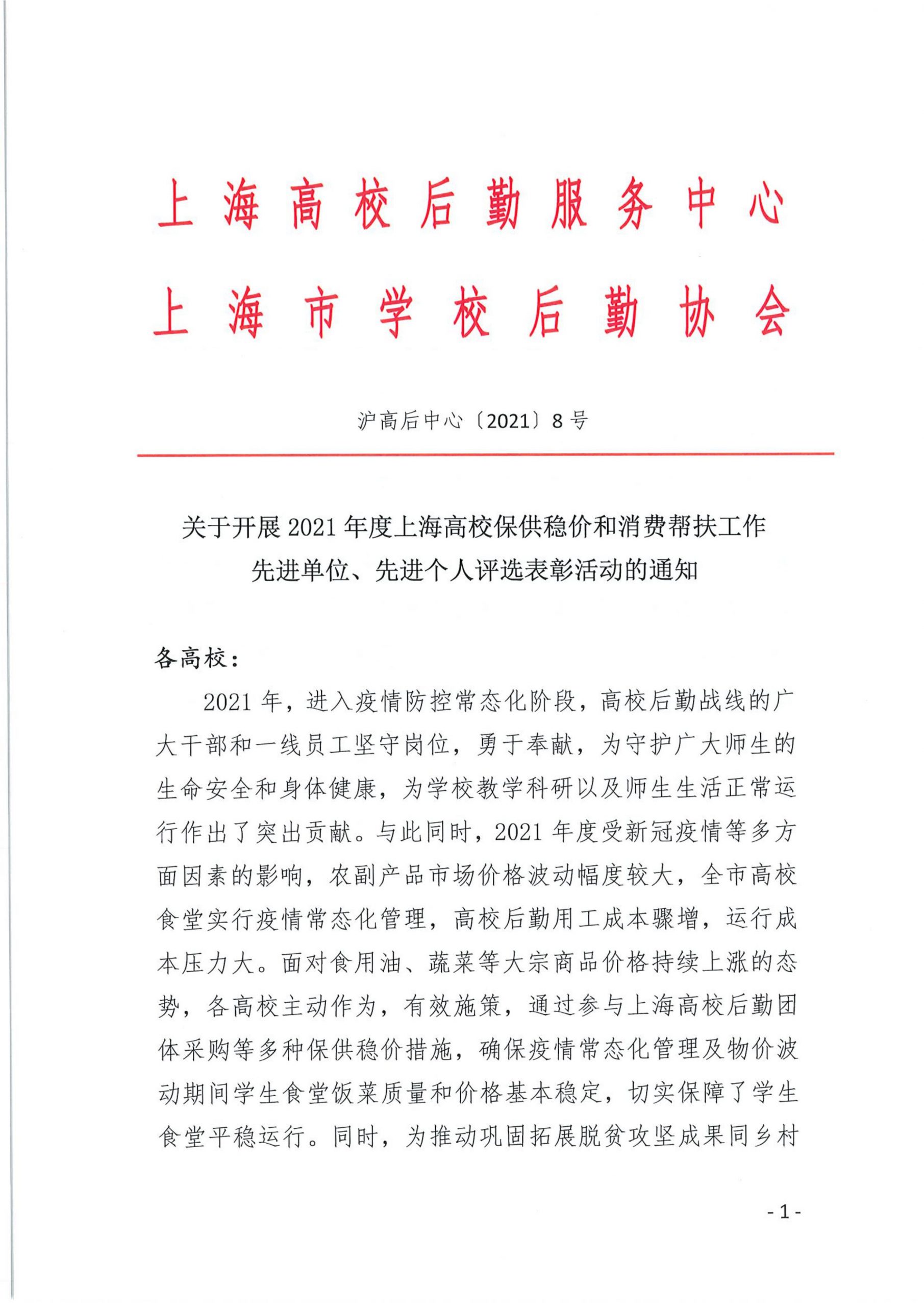 关于开展2021年度上海高校保供稳价和消费帮扶工作 先进单位、先进个人评选表彰活动的通知