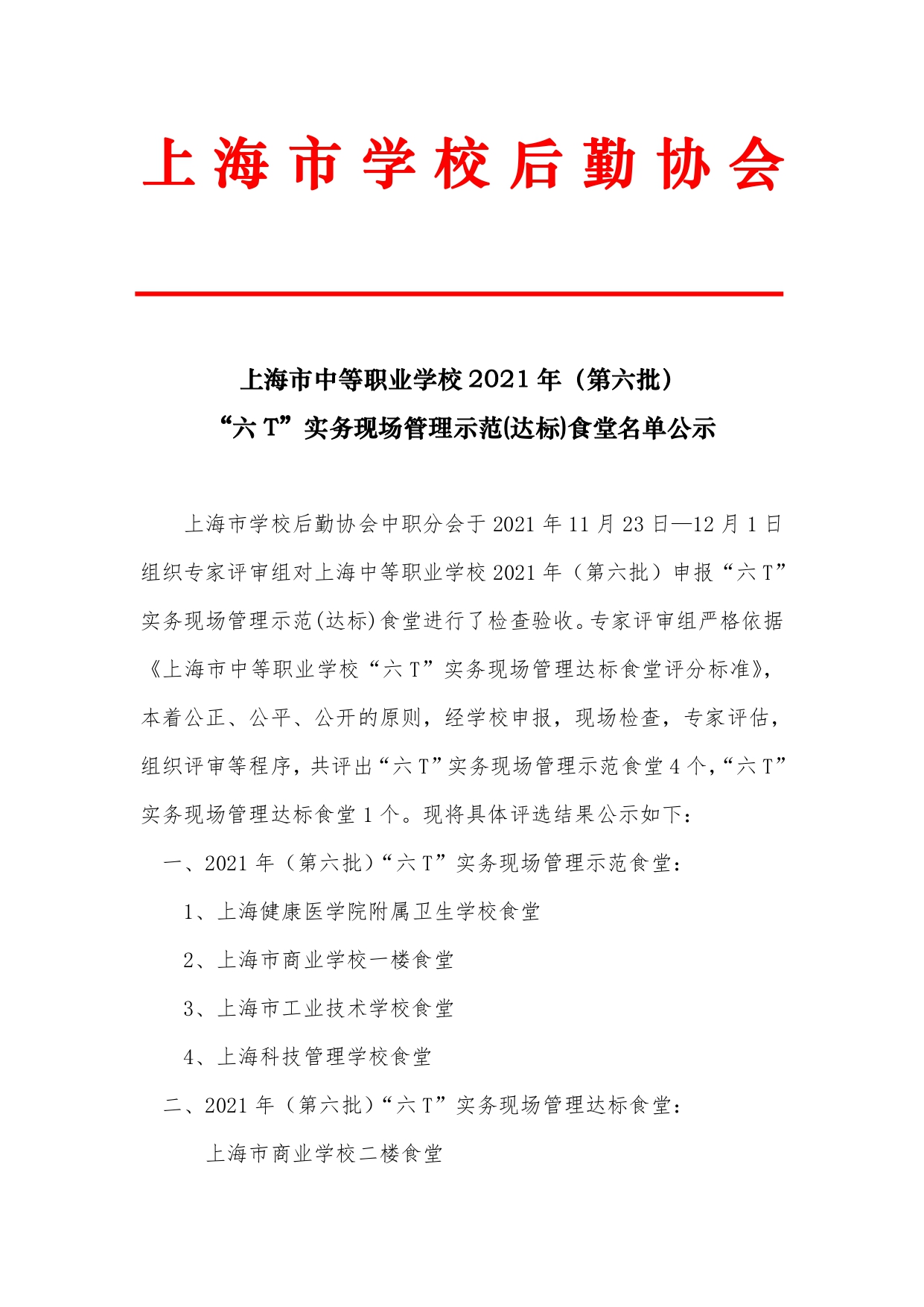 上海市中等职业学校 2021 年(第六批) “六 T”实务现场管理示范(达标)食堂名单公示