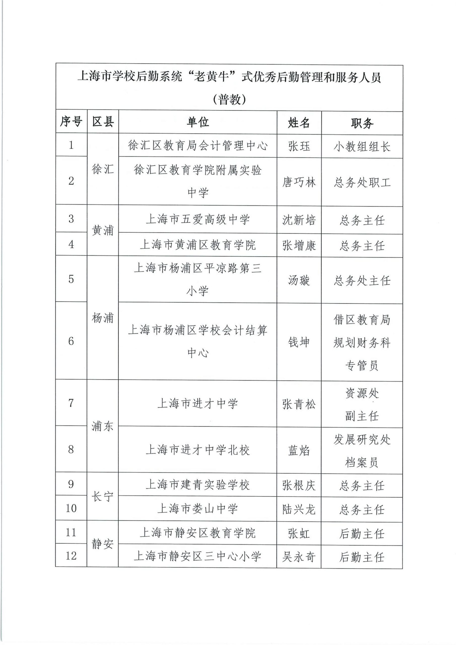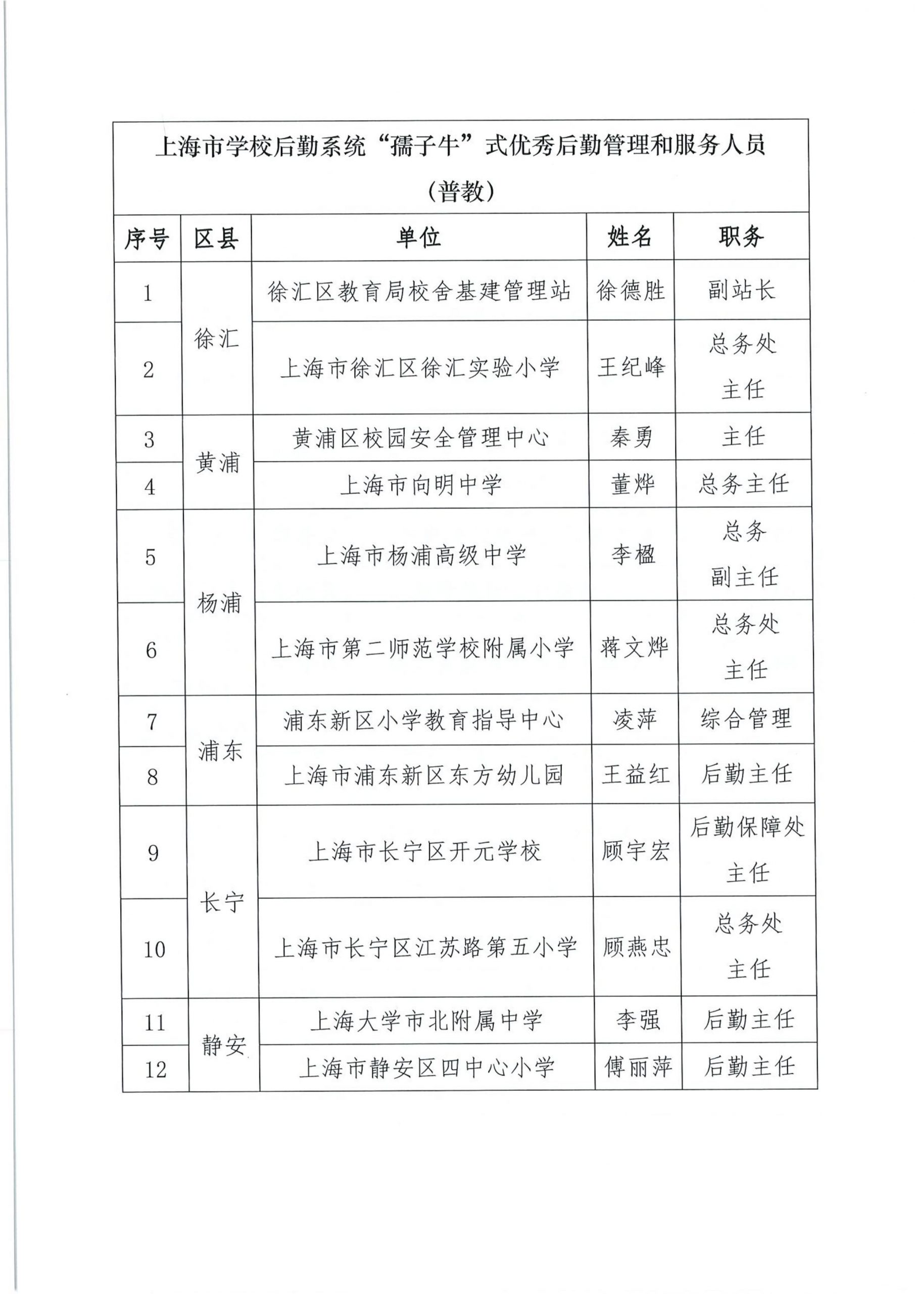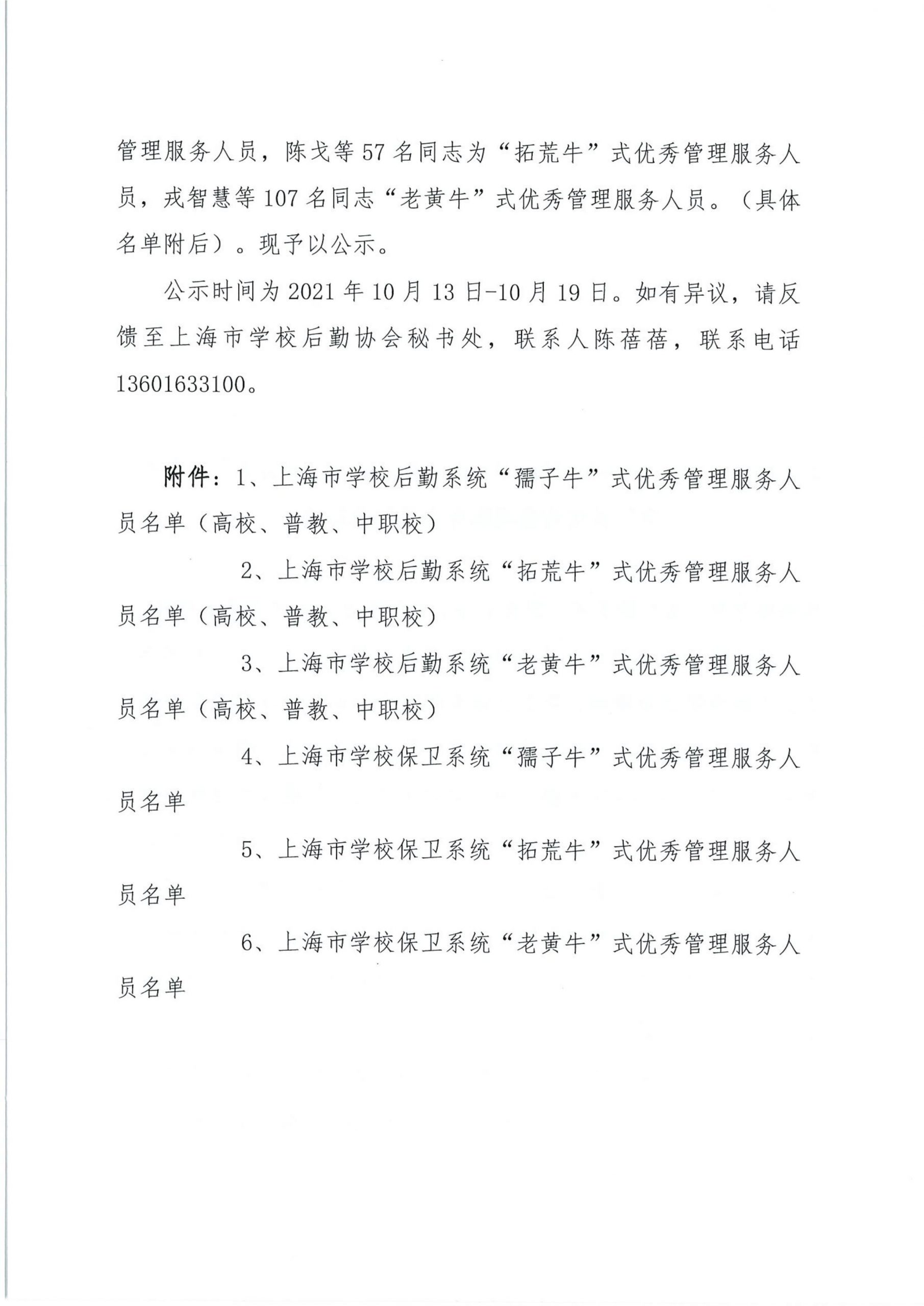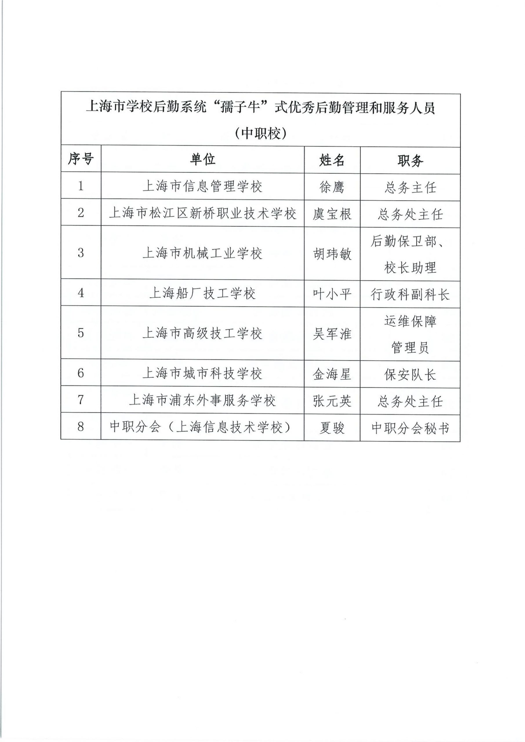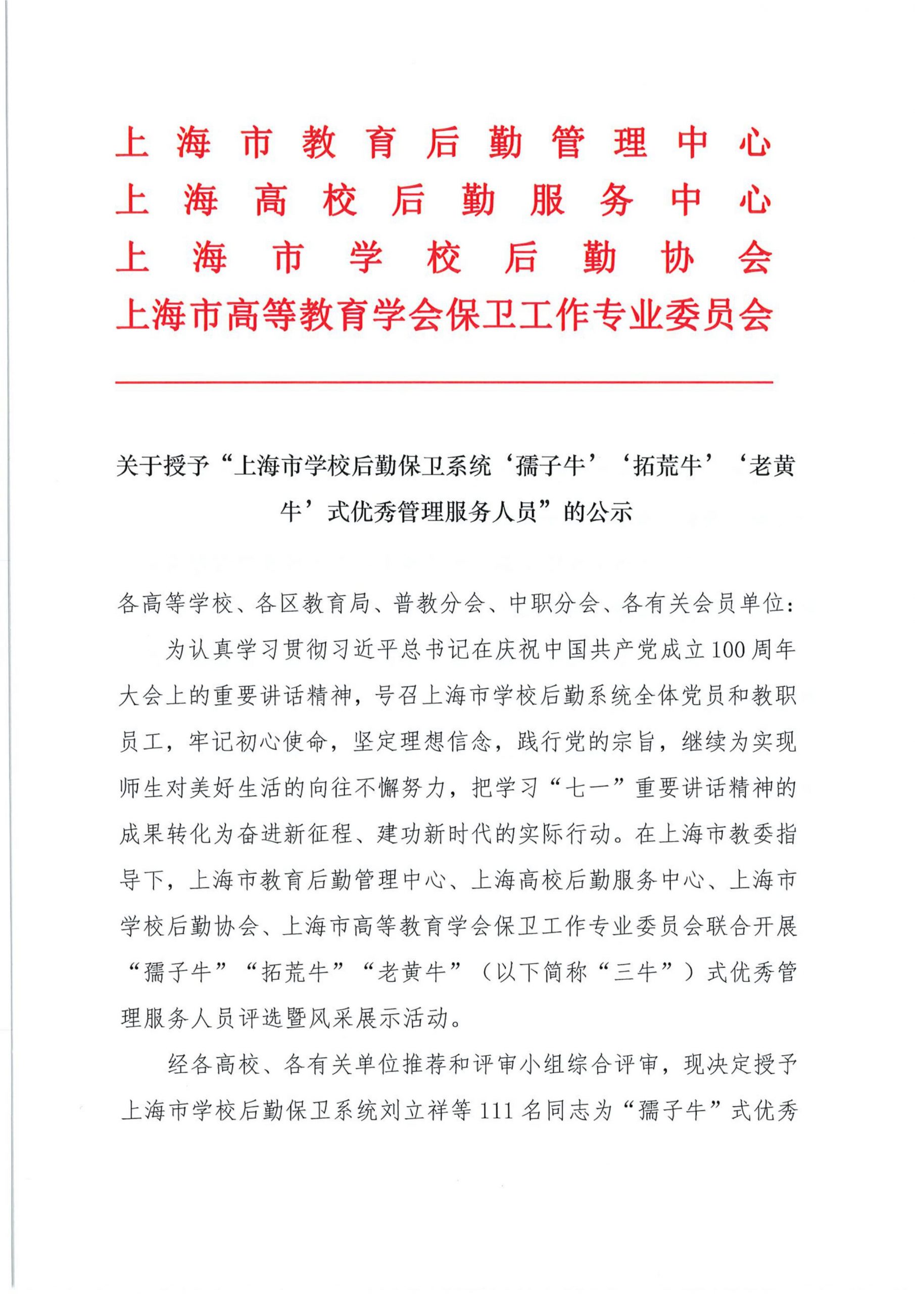 关于组织开展“上海市学校后勤保卫系统‘孺子牛’‘拓荒牛’‘老黄牛’式优秀管理服务人员”的公示