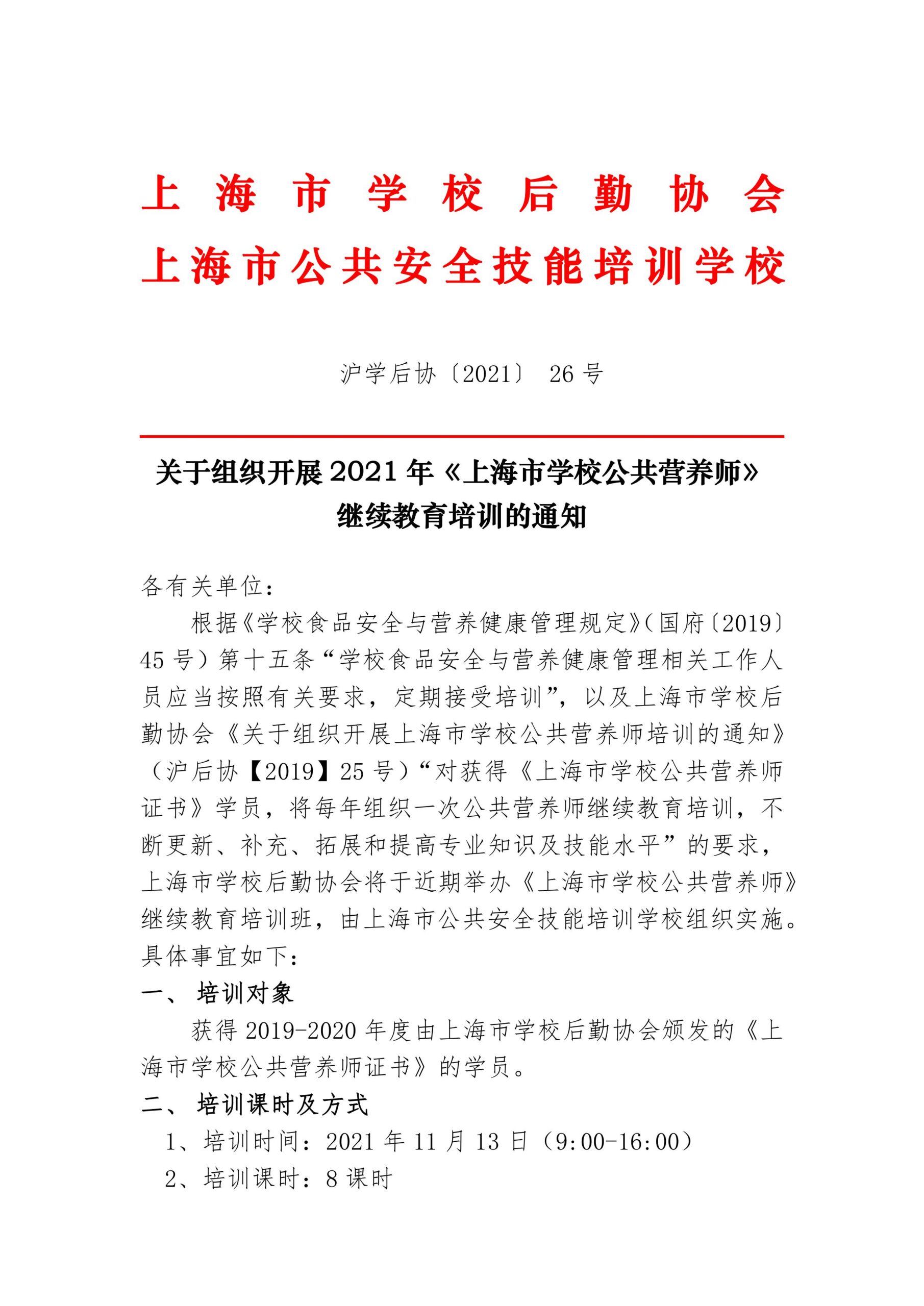 关于组织开展2021年《上海市学校公共营养师》继续教育培训的通知