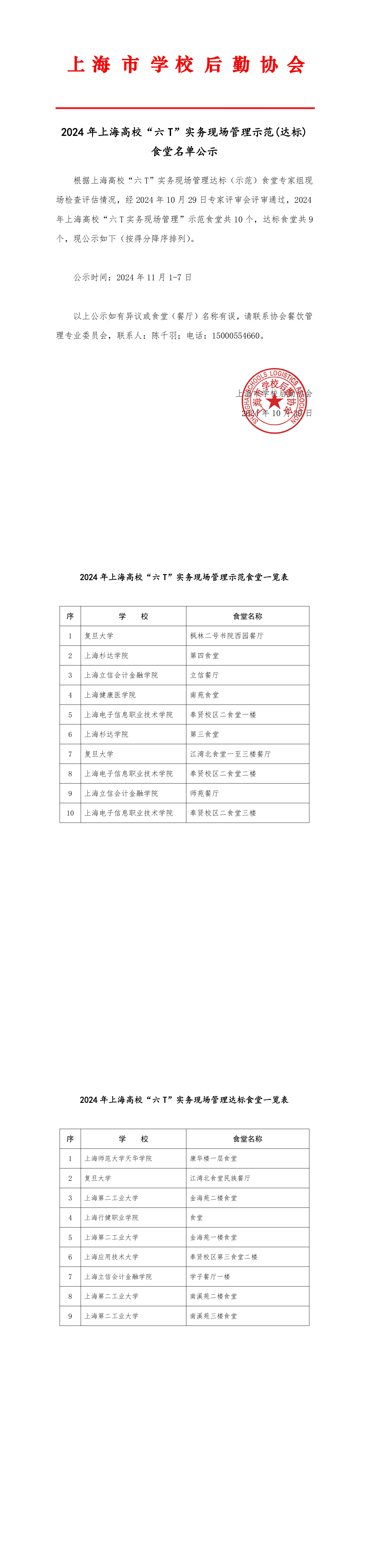 2024年上海高校“六T”实务现场管理示范(达标)食堂名单公示