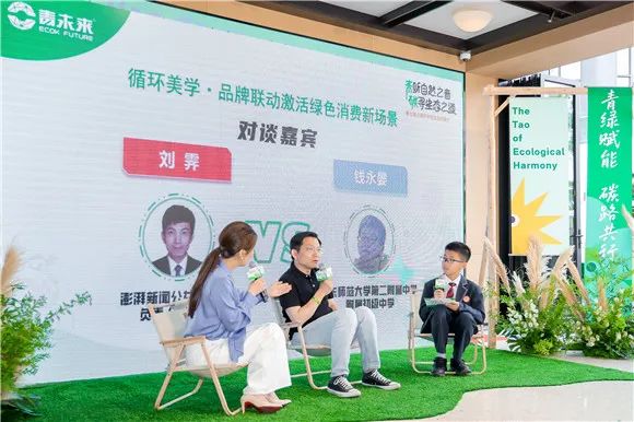 “循环新生·品牌联动激活绿色消费新场景”,华东师范大学第二附属中学附属初级中学学生钱永晏将咖啡渣变身纯天然洗手液,与澎湃新闻公益事业部主编刘霁畅聊环保产品的商业潜力。