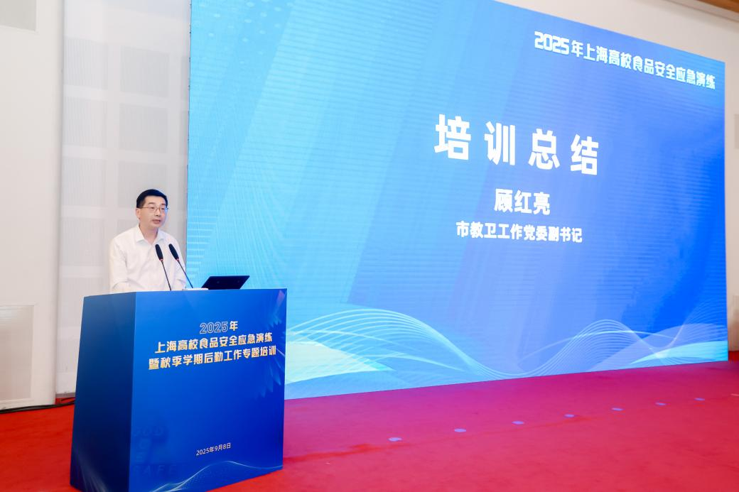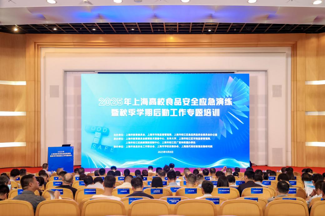 为进一步提升高校食品安全突发事件应急处置能力,提升高校后勤管理水平,推动高校后勤工作高质量发展,9月8日下午,2025年上海市高校食品安全突发事件应急处置演练暨秋季学期后勤工作专题培训在东华大学松江校区举行。本次演练由市教委、市市场监管局主办,市教委教育技术装备中心牵头承办。市教卫工作党委副书记顾红亮出席活动并讲话。东华大学副校长阎林平致欢迎词,市市场监管局餐饮食品安全监督管理处处长黄丽瑢现场点评。活动由市教委后保处处长贺小虎主持,全市各高校分管校领导、后勤部门负责人及相关单位代表共计200余人参加演练及培训。