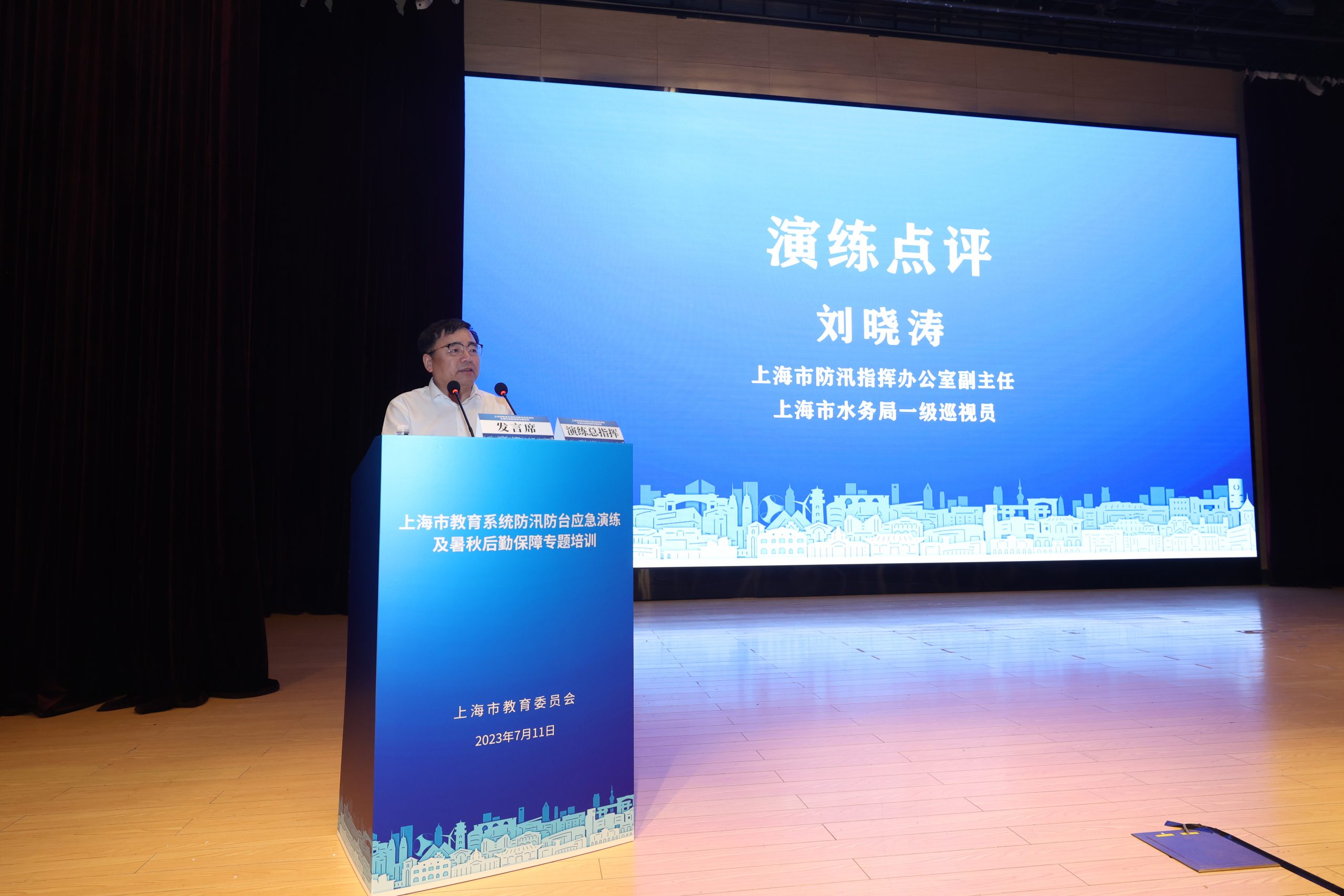 演练结束后,市防汛办副主任、市水务局副局长刘晓涛对演练活动进行点评。市教卫工作党委副书记、市教委副主任闵辉做总结讲话,对暑期学校后勤领域安全稳定工作进行了再动员、再部署、再强调。一是分析了学校后勤领域安全工作形势,具体就学校食品安全、燃气消防安全和防汛防台几方面通报了全国、全市近期发生的问题;二是强调了教育系统暑秋后勤安全方面要开展的重点工作;三是提出了下步工作要求,要求学校要抓高效协同协作,拧紧校园安全责任链条;要抓基础设施建设,扎紧校园安全工作篱笆;要抓员工安全培训,从源头防范校园安全隐患。最后他激励大家要再接再厉,继续打牢安全基础,为本市教育系统高质量发展提供坚强保障。